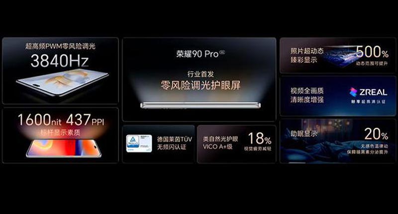 此次發(fā)布會帶來了榮耀90和榮耀90 Pro,全系首發(fā)搭載了2億像素寫真相機(jī),以及3840Hz超高頻PWM零風(fēng)險(xiǎn)調(diào)光功能。榮耀終端有限公司 CEO 趙明先生稱,這次的榮耀 90 系列,他們希望在影像(2 億像素寫真相機(jī))、屏幕(3840Hz 超高頻 PWM 零風(fēng)險(xiǎn)調(diào)光護(hù)眼屏)、續(xù)航(5000mAh 高密度超大容量電池)這三個領(lǐng)域有所突破。